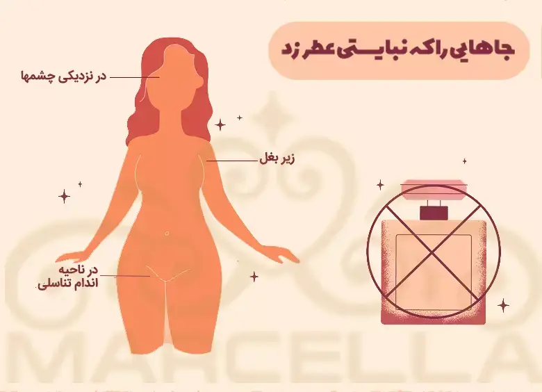 درست است که آدم دلش میخواهد همه نقاط بدنش را با رایحه عطر مورد علاقهاش بپوشاند. اما نقاطی وجود دارند که نه تنها برای عطر زدن مناسب نیستند، بلکه بر عکس، مضر هم هستند. در تصویر زیر این نقاط را نشان دادهایم: